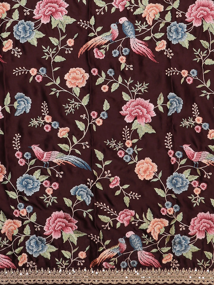 Drape yourself in classic elegance with this luxurious Wine Satin Saree. The smooth, glossy drape beautifully enhances your silhouette, while the shimmering golden sequin lace border adds a graceful festive sparkle. Paired with a stunning embroidered blouse featuring colorful floral and bird motifs, this ensemble blends modern charm with timeless craftsmanship. Perfect choice for weddings, receptions, festivals, and grand celebrations.