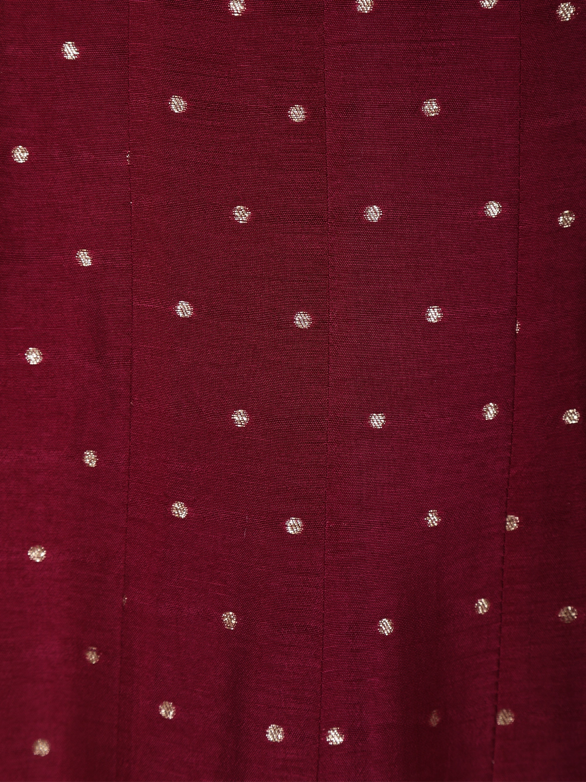 Graceful and effortlessly elegant, this wine georgette gown is a timeless addition to your festive wardrobe. Crafted in a soft, flowy georgette fabric, the gown features delicate polka dot embroidery spread evenly across the body, creating a refined shimmer that enhances its sophisticated appeal.