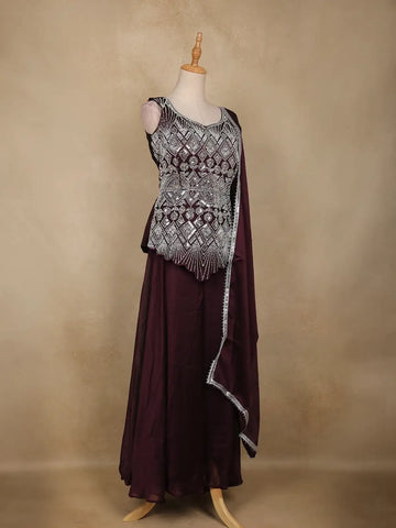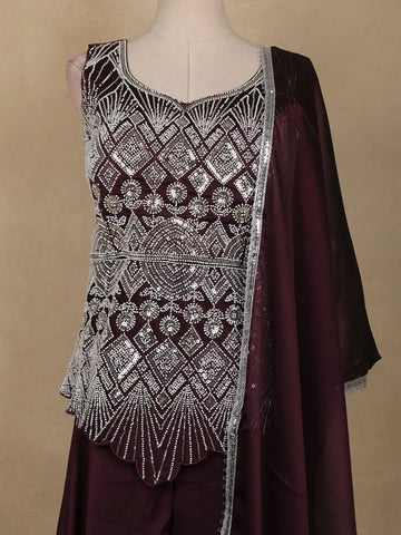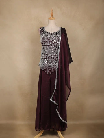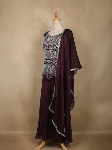 The flowing palazzo bottoms add comfort and grandeur, making it ideal for festive occasions and parties. Paired with a matching wine georgette dupatta bordered with delicate sequin accents, this outfit radiates charm and grace with every step.