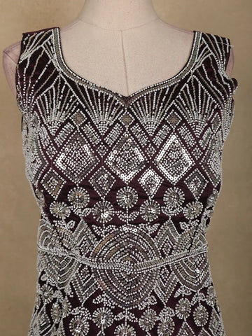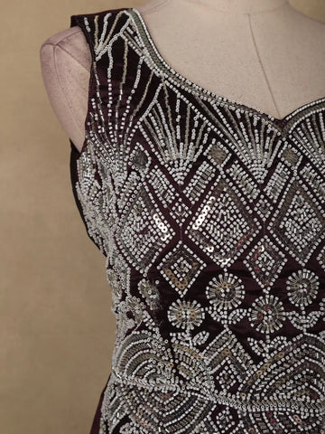 Step into elegance with this striking wine-colored palazzo suit, crafted in luxurious georgette fabric. The ensemble features a sleeveless kameez adorned with dazzling sequin embroidery in intricate geometric and floral patterns, creating a perfect balance of shimmer and sophistication.
