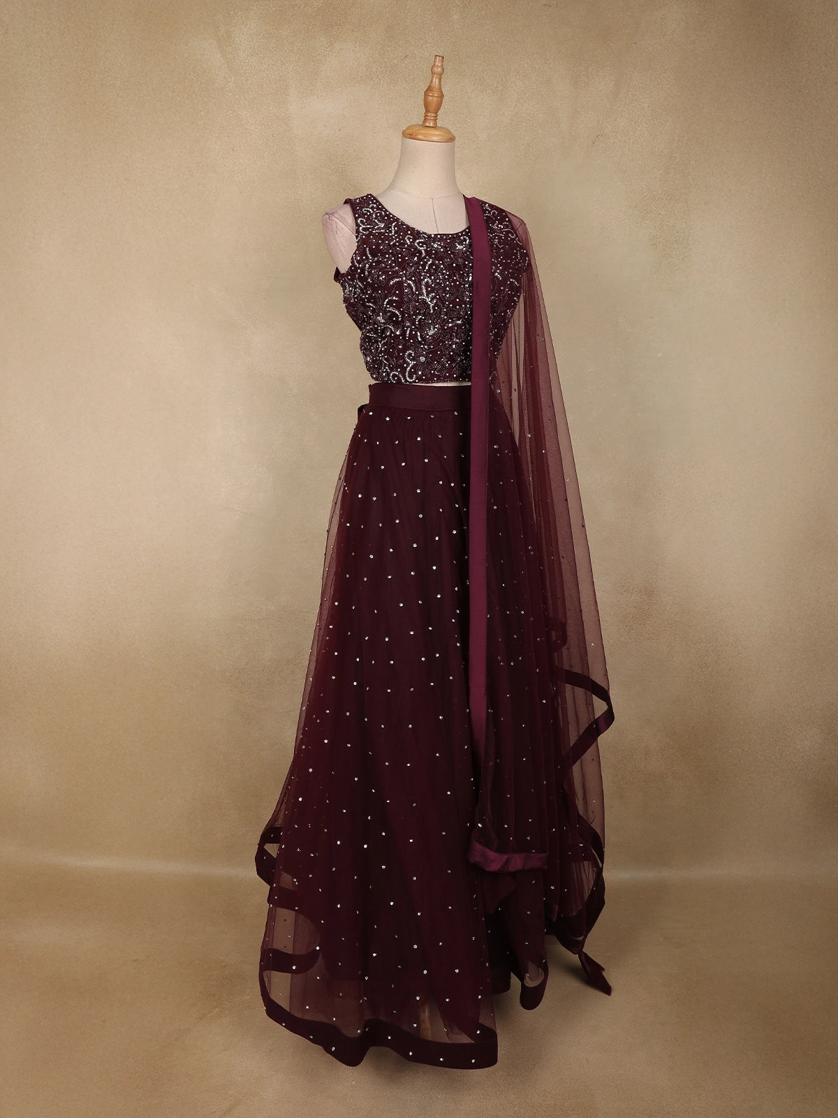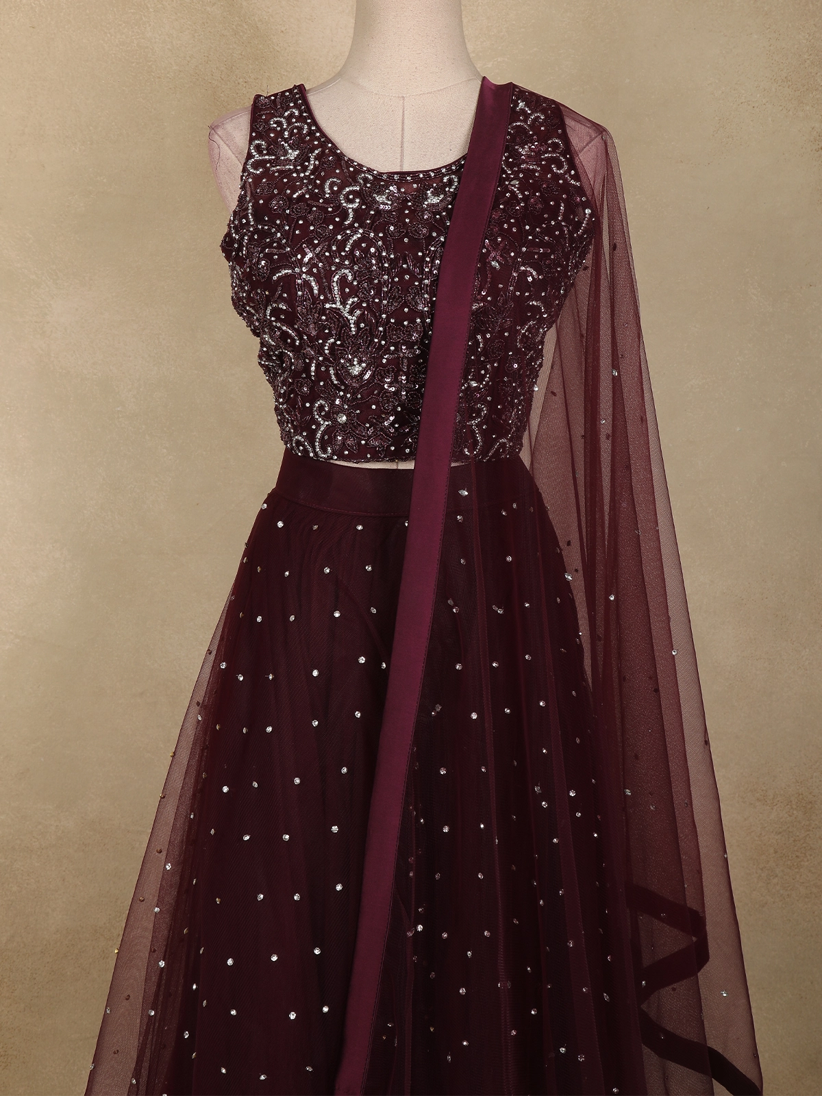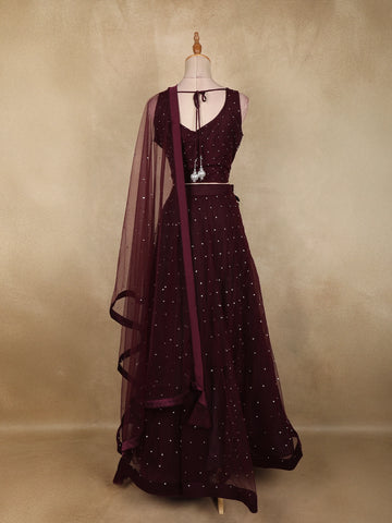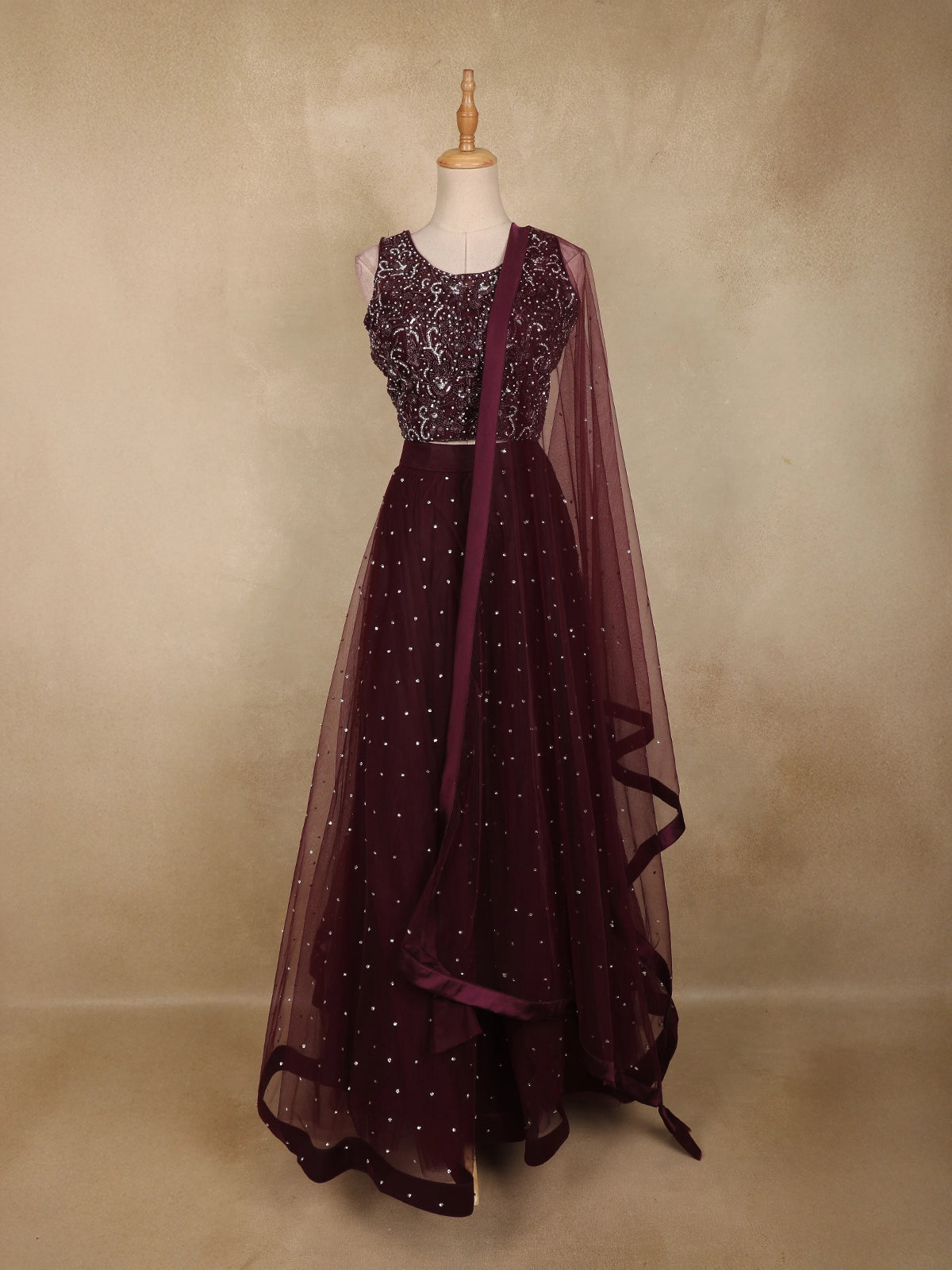 Wine Sequins and Beads Embroidered Design Net Lehenga With Net Dupatta