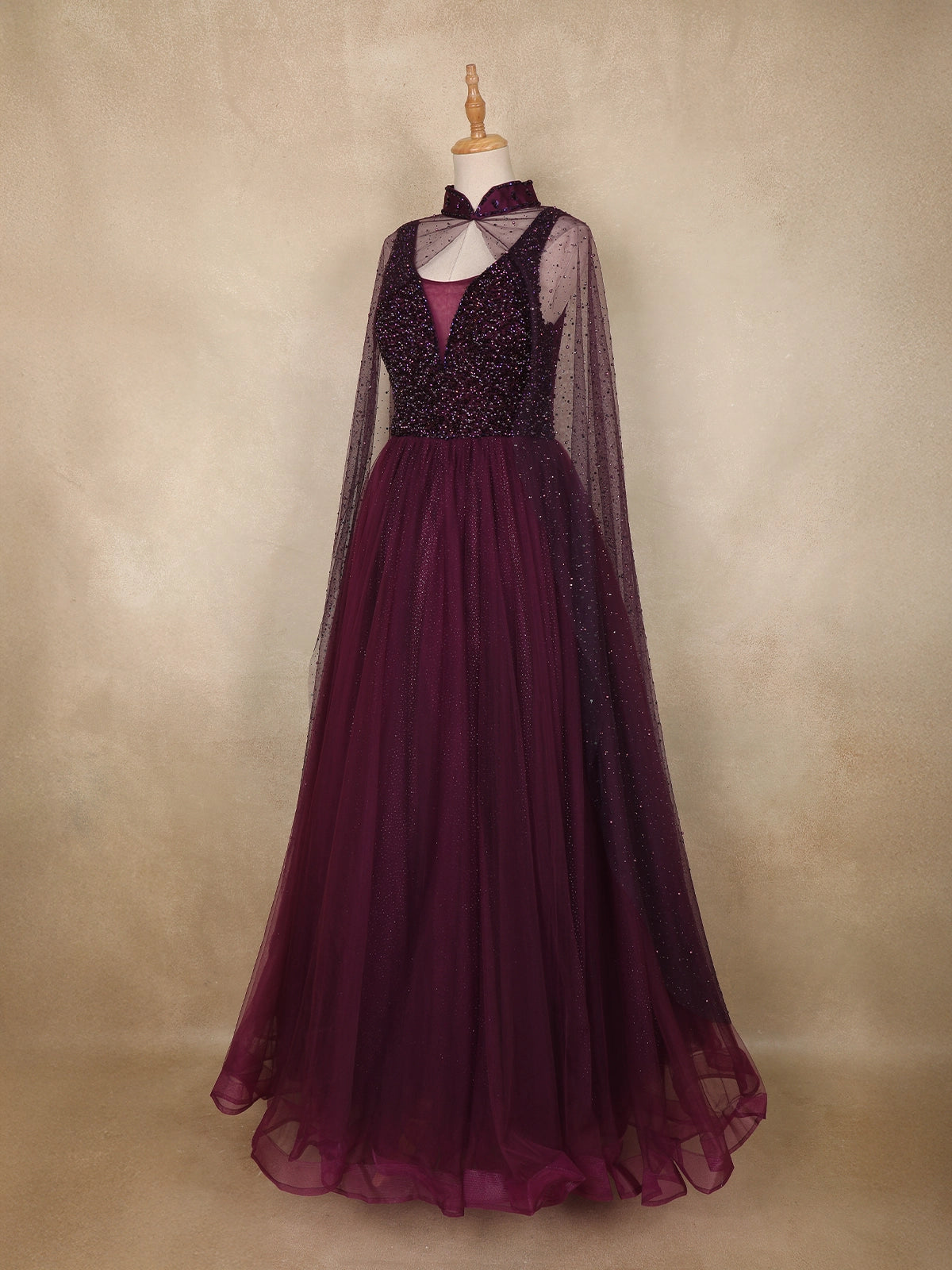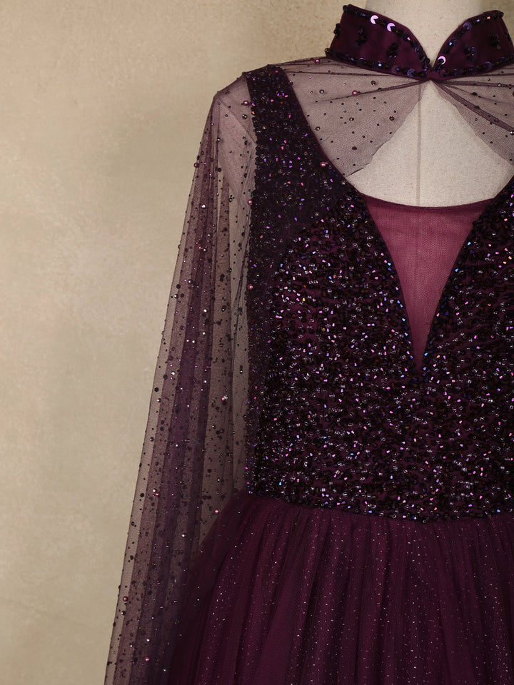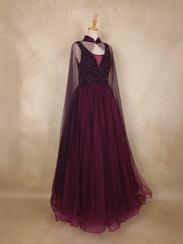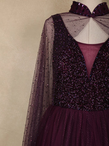 Wine Sequins Designed Net Gown with Pearl Cape Sleeves