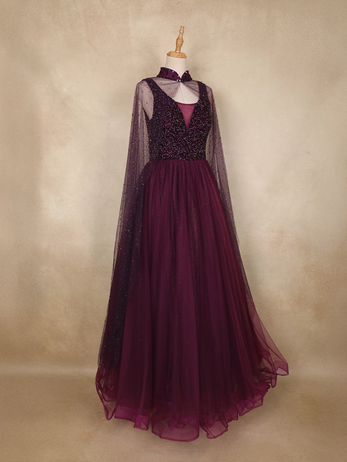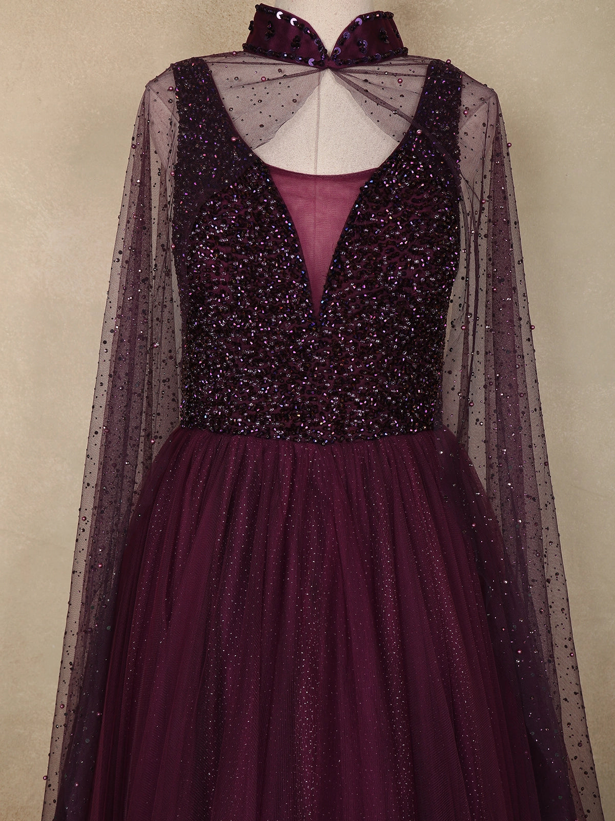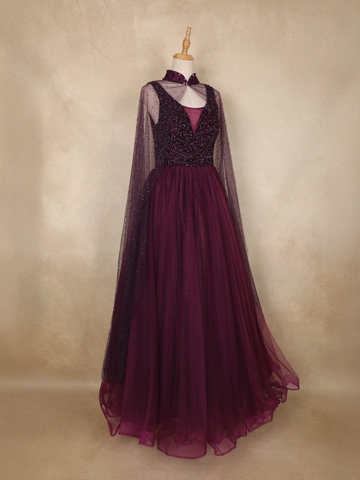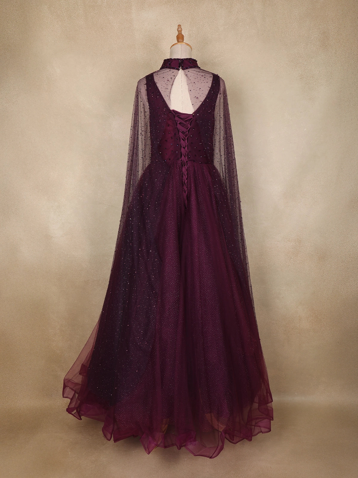 Making a statement are the cape-style net sleeves, richly adorned with scattered sequins and pearls that cascade down gracefully to wrist-length, creating an ethereal drape effect. The back of the gown features a lace-up corset design, ensuring both elegance and a flattering, adjustable fit.