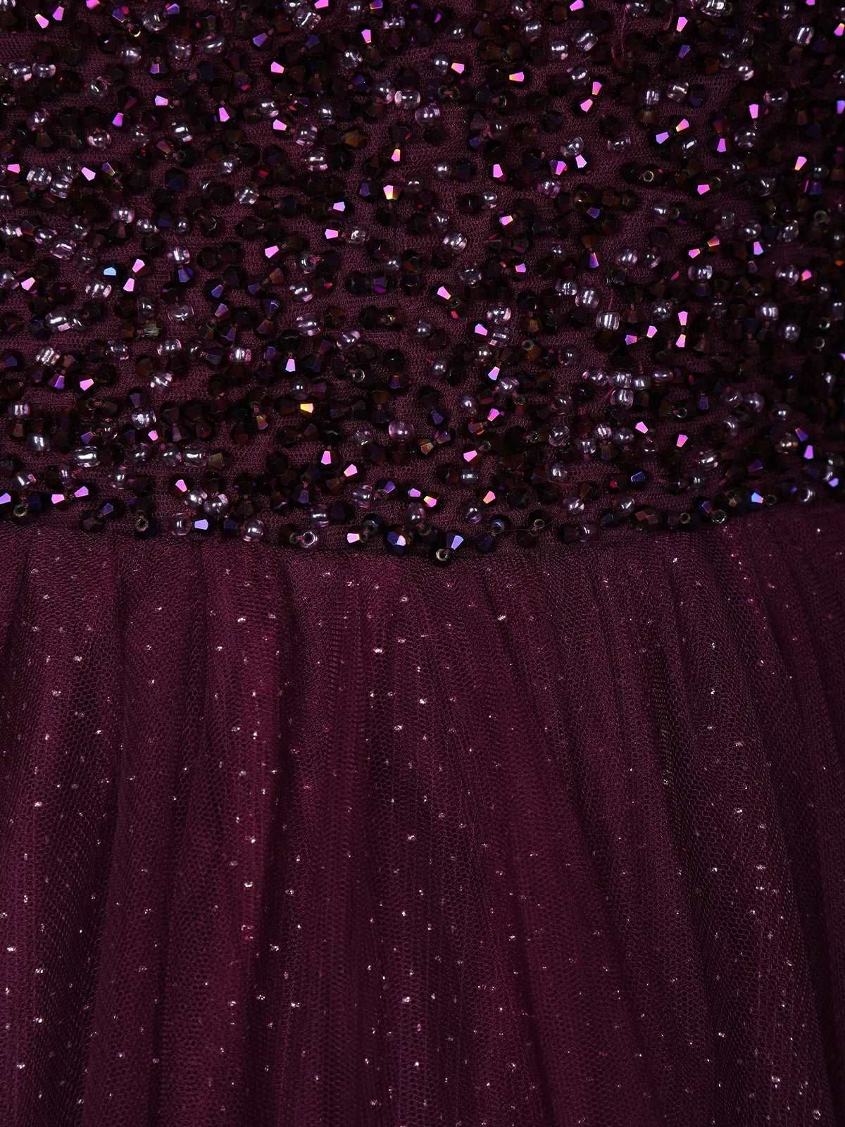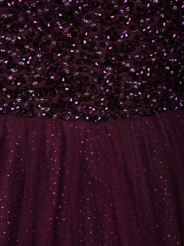 Step into elegance with this breathtaking wine gown, crafted for a fairytale celebration. The fitted bodice dazzles with heavy sequin and bead embroidery in wine, creating a radiant shimmer that's perfect for spotlight moments. A deep illusion V-neckline is softened by a sheer net yoke, adding sophistication and modesty to the plunging cut.