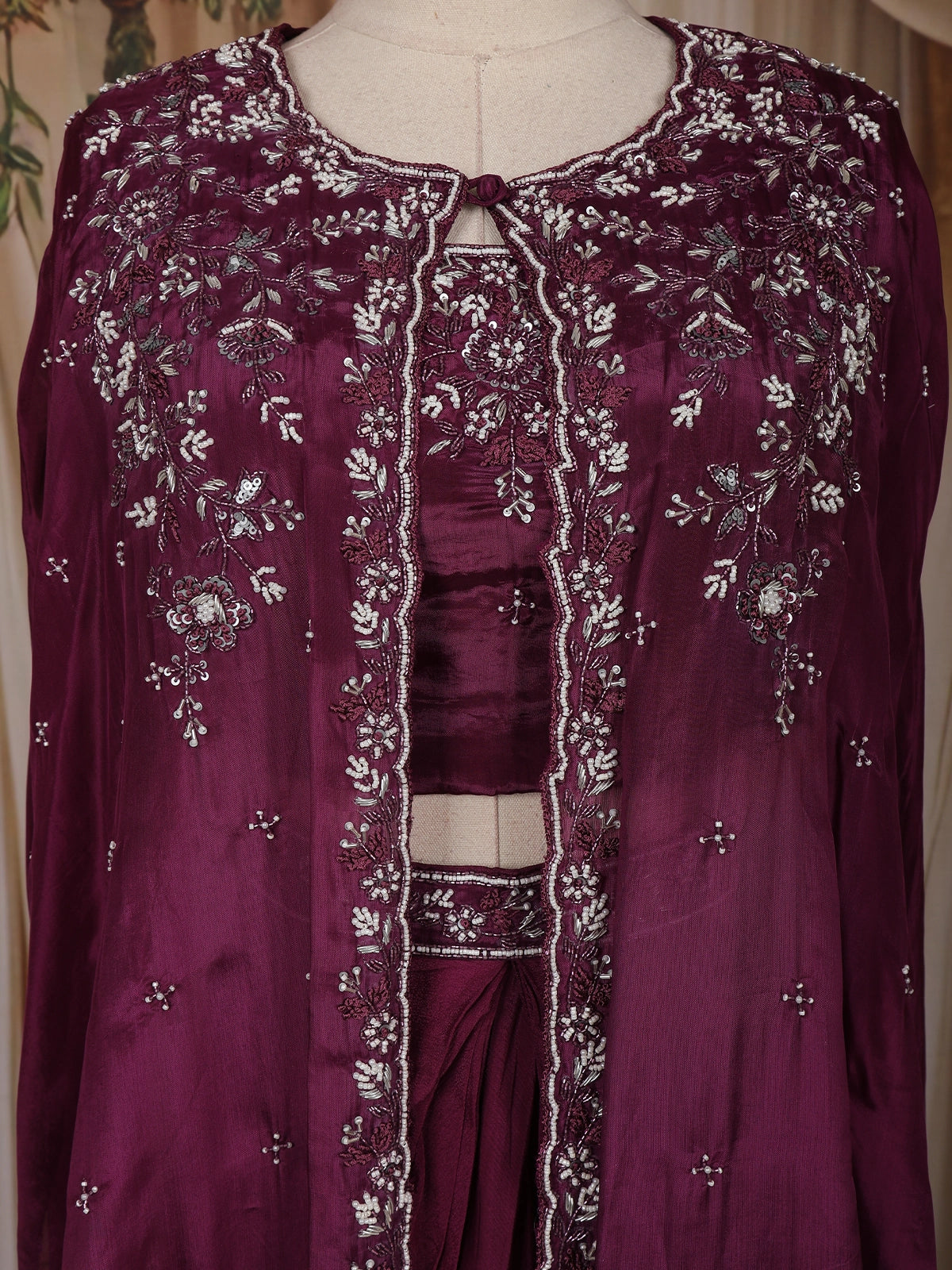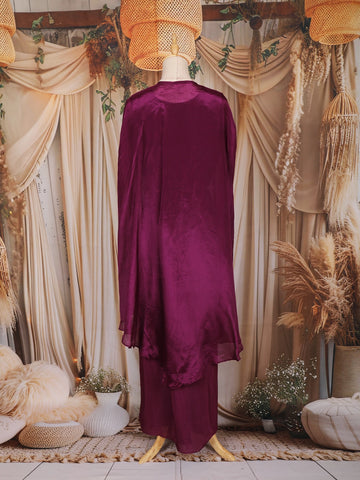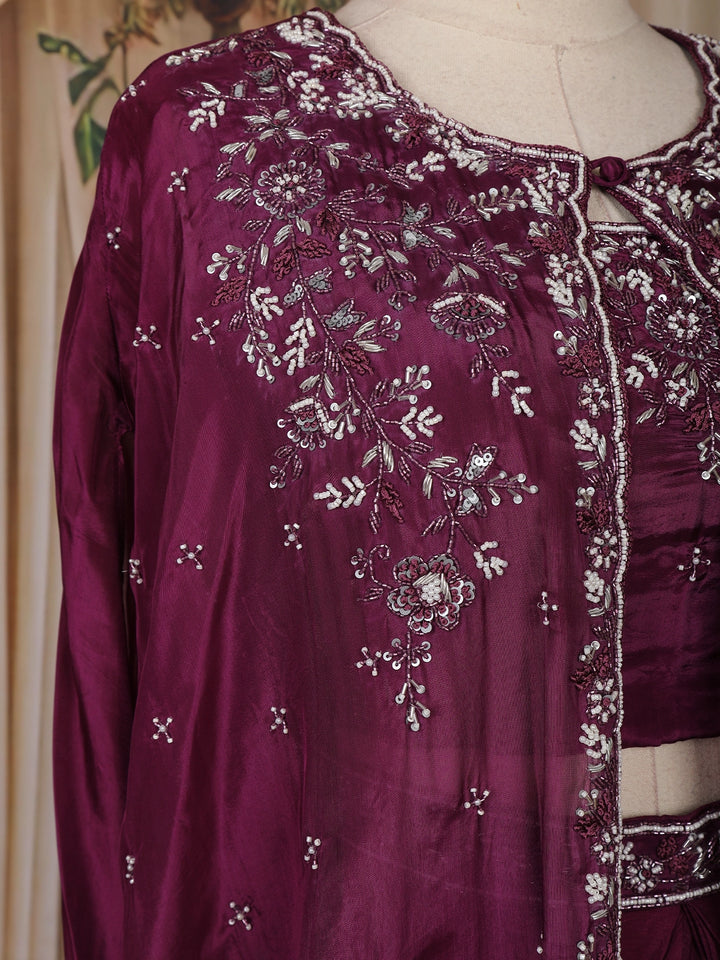 Wine Sequins Embroidered Design Crepe Silk Skirt Top with Cape Jacket