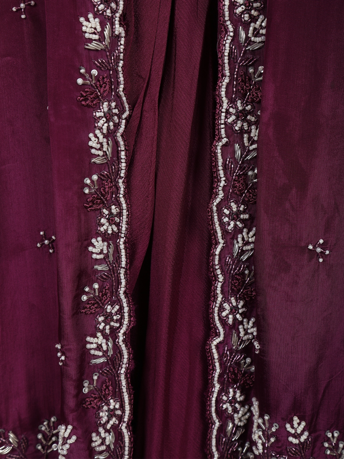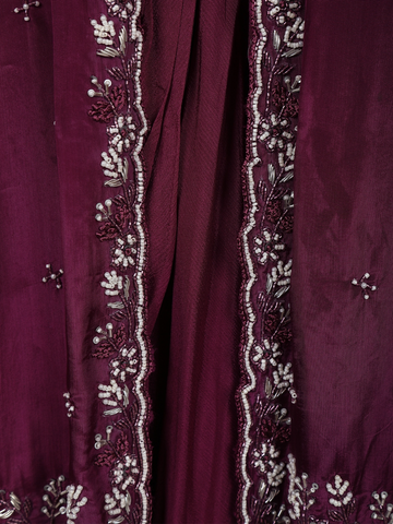 The deep wine hue exudes richness and poise, while the glimmering embellishments add just the right amount of sparkle — making this outfit a standout choice for those who love refined glamour and timeless appeal.