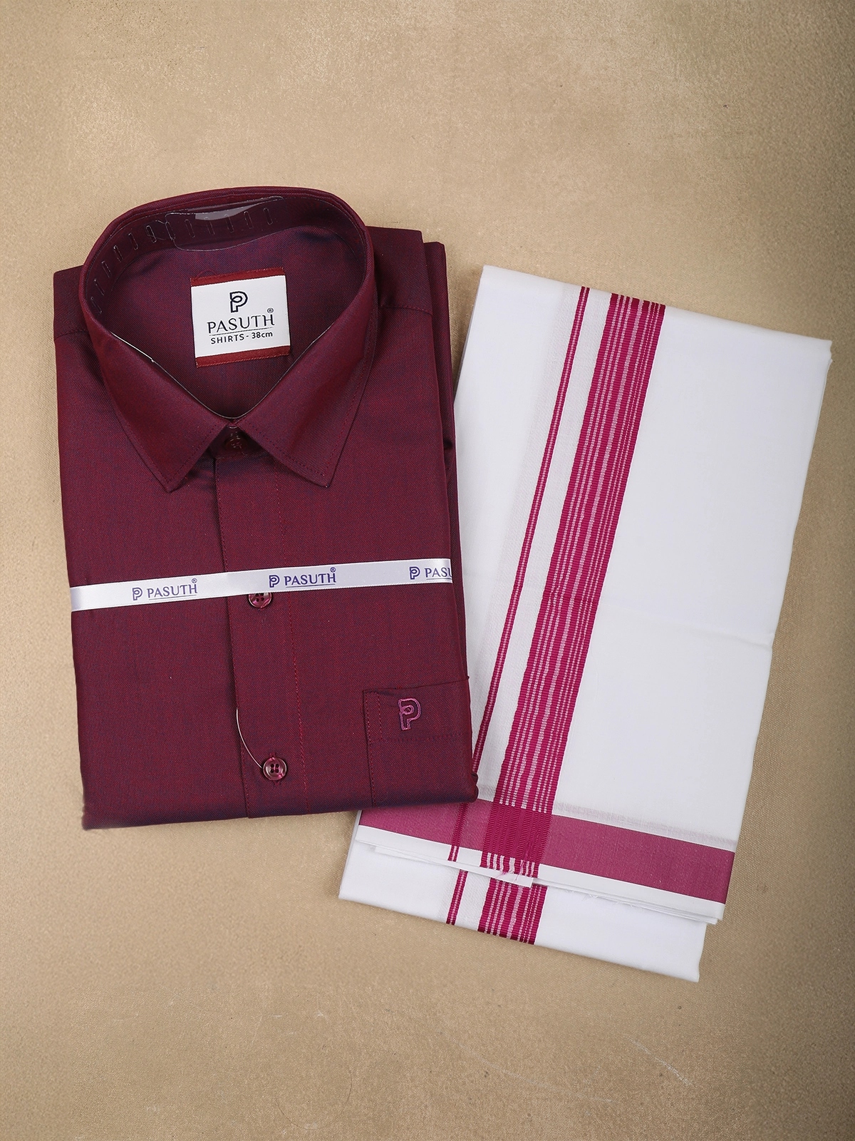 Wine Solid Shirt with White Dhoti Featuring Wine Woven Border