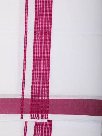 The crisp white dhoti adds a graceful contrast, highlighted with rich wine-colored woven borders and stripe accents that complete the coordinated look beautifully. Traditional yet modern in appeal, this set is ideal for weddings, engagements, temple ceremonies, festive celebrations, or gifting.