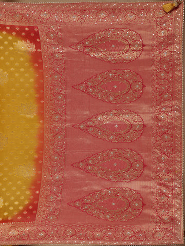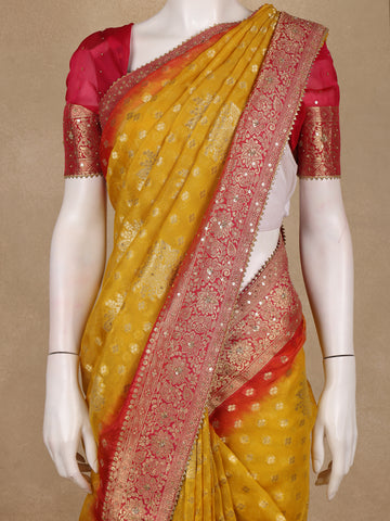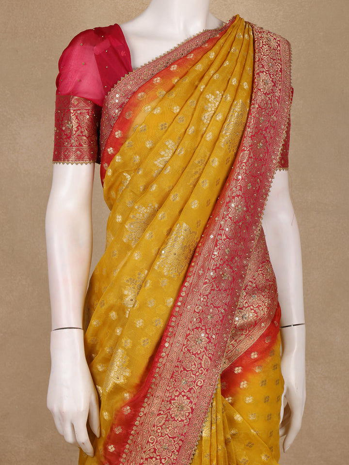 The striking Red contrast blouse and pallu create a bold and graceful pairing against the vibrant yellow base, enhancing its festive appeal. The zari border lends a rich, ornate finish, making this saree a perfect choice for parties, weddings, and grand celebrations.