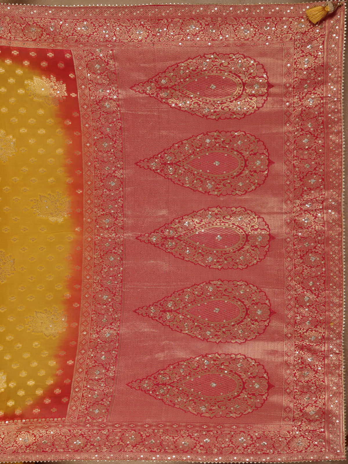 Drape yourself in timeless elegance with this enchanting Yellow Banarasi Silk Saree, designed to add a radiant charm to your festive and party wear collection. The saree features exquisite woven butta motifs across the body, blending traditional artistry with a touch of sophistication.