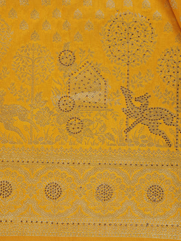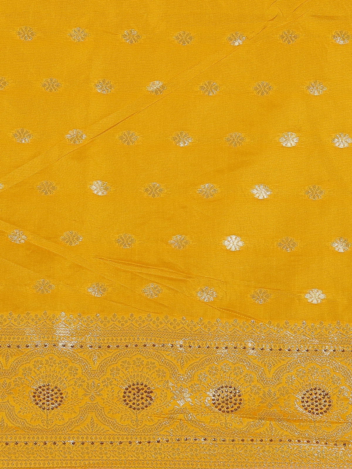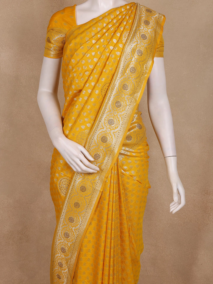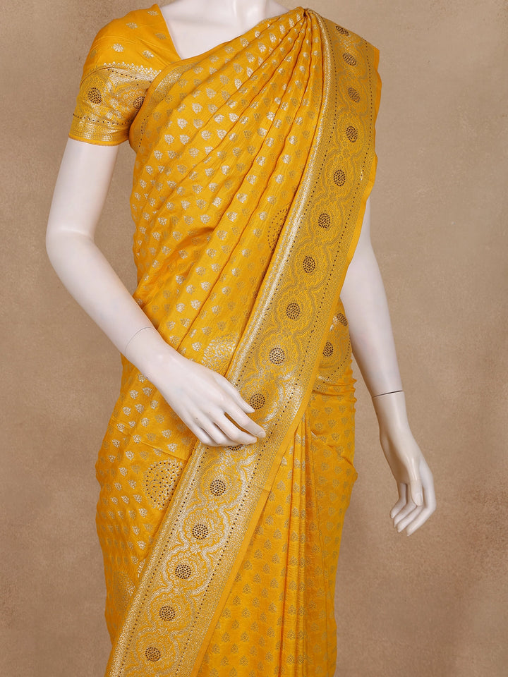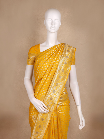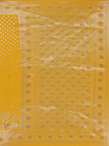 Paired with a matching yellow blouse and pallu, the saree presents a seamless tone-on-tone elegance that highlights its luxurious zari weave. The classic zari border adds a regal shimmer, framing the saree with subtle grandeur — perfect for weddings, poojas, or festive celebrations.