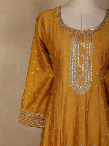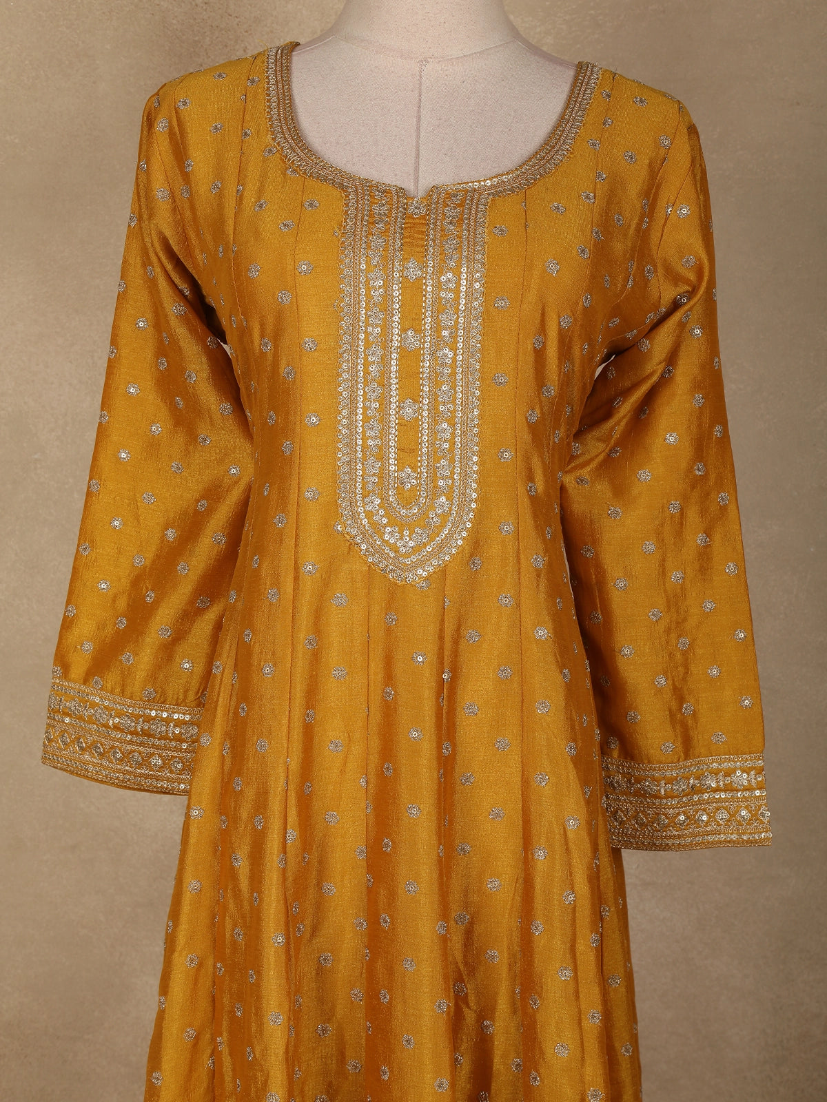 Brighten up your festive and occasion wear collection with this yellow floral embroidered georgette gown, designed to offer a perfect blend of elegance and comfort. Crafted from lightweight georgette fabric, this gown flows beautifully with a soft, airy drape, making it ideal for long celebrations.