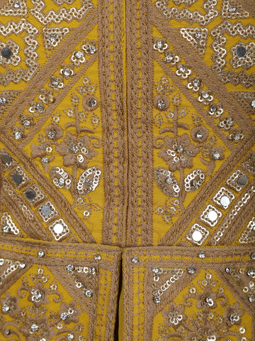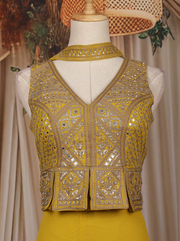 Step into graceful elegance with this Yellow Floral and Geometric Embroidered Georgette Palazzo Suit, crafted to elevate your festive and party wardrobe. The outfit features a sleeveless V-neck top intricately adorned with floral thread and sequin embroidery, exuding refined charm and shimmer. The lightweight georgette fabric drapes beautifully, offering fluid movement and comfort throughout the day. Paired with wide-legged palazzo pants and a matching embroidered dupatta, this ensemble blends traditional artistry with modern silhouette.