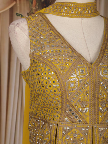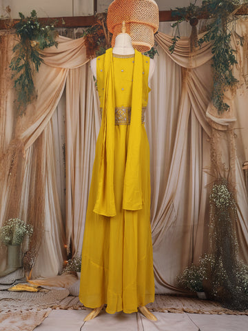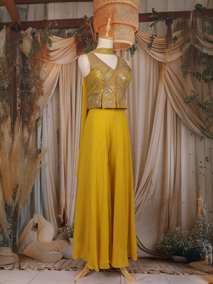 Yellow Floral and Geometric Embroidered Georgette Palazzo Suit