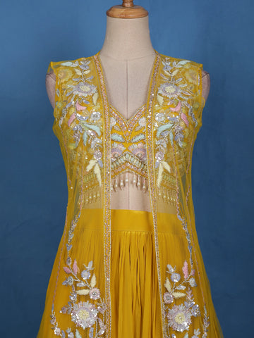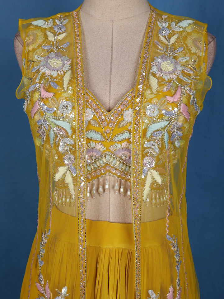 Step into the spotlight with this Sunshine Yellow Floral Net Lehenga Set, a blend of traditional craftsmanship and modern finesse. The intricately hand-embroidered floral motifs in pastel hues of pink, lavender, and mint shimmer beautifully against the golden yellow base, evoking festive joy and radiance. Perfect for wedding functions, haldi ceremonies, or sangeet evenings, this ensemble promises to make you glow with unmatched elegance.
