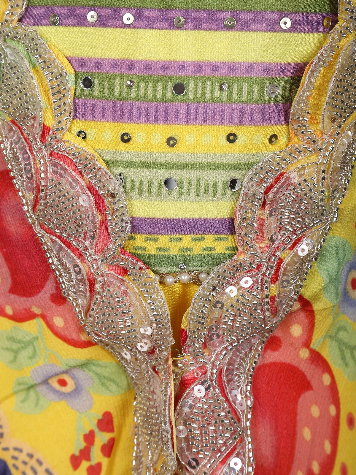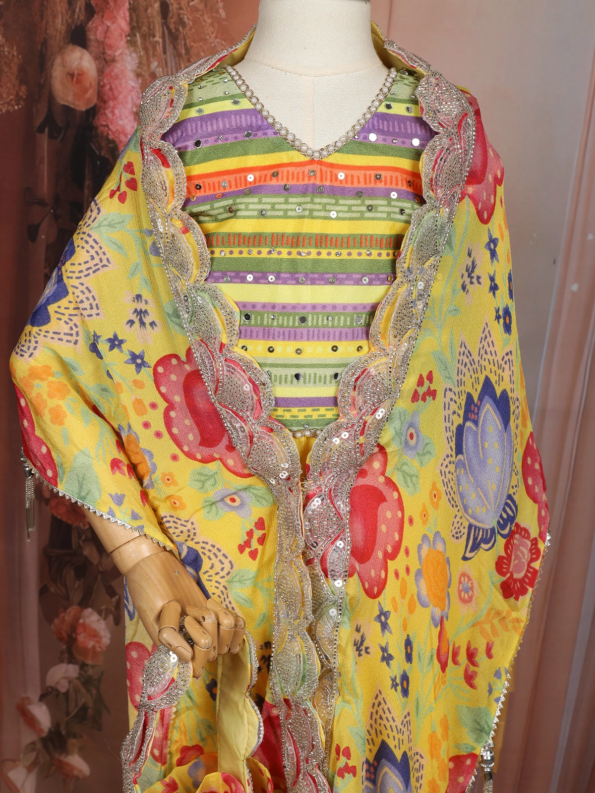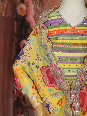 Bright, playful, and beautifully festive, this Yellow Floral Printed Design Georgette Kids Palazzo Suit is a delightful choice for little girls who love to dress up for special occasions. The kurta features vibrant multicolor horizontal stripes that add a cheerful ethnic charm, perfectly complemented by the flowing yellow georgette palazzo that ensures comfort and ease of movement throughout the day.