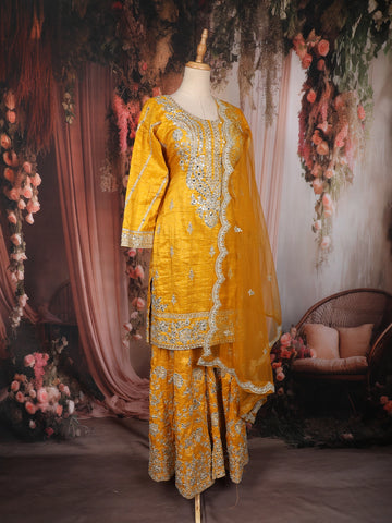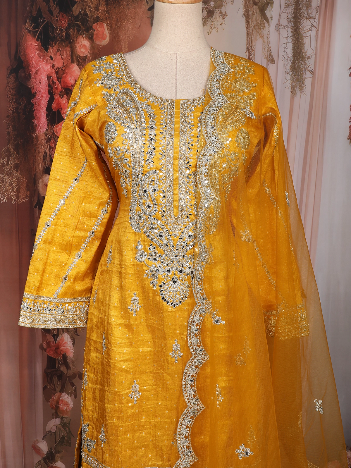 Yellow Floral Sequins and Beads Embroidered Design Tissue Palazzo Suit