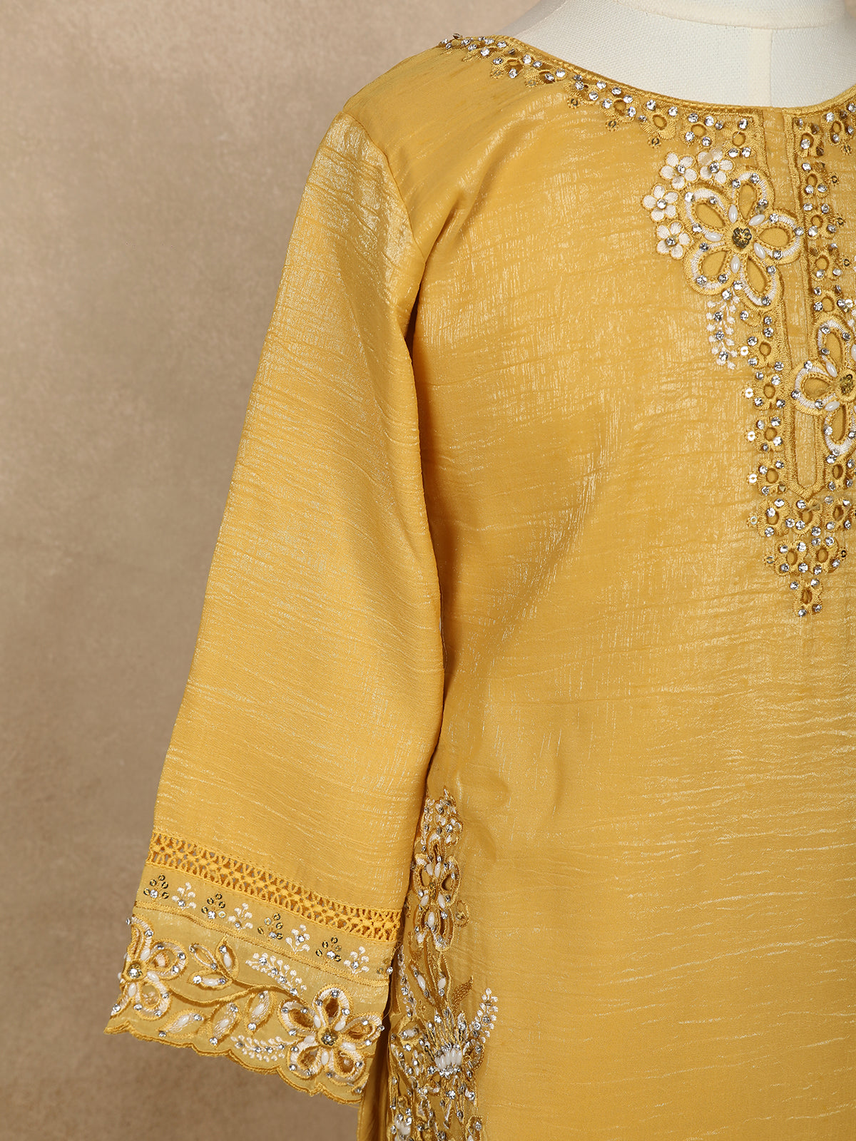 Let your little one shine in this elegant yellow floral sequins embroidered palazzo suit, thoughtfully crafted in shimmering tissue silk for a festive, royal appeal. The kurta features delicate floral motifs embellished with sequins, beads, and stones, adding a touch of sparkle to every move.