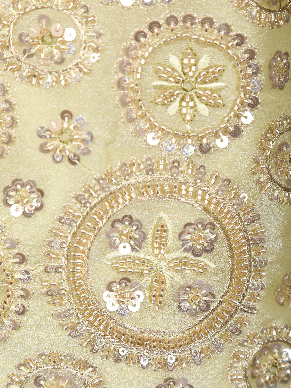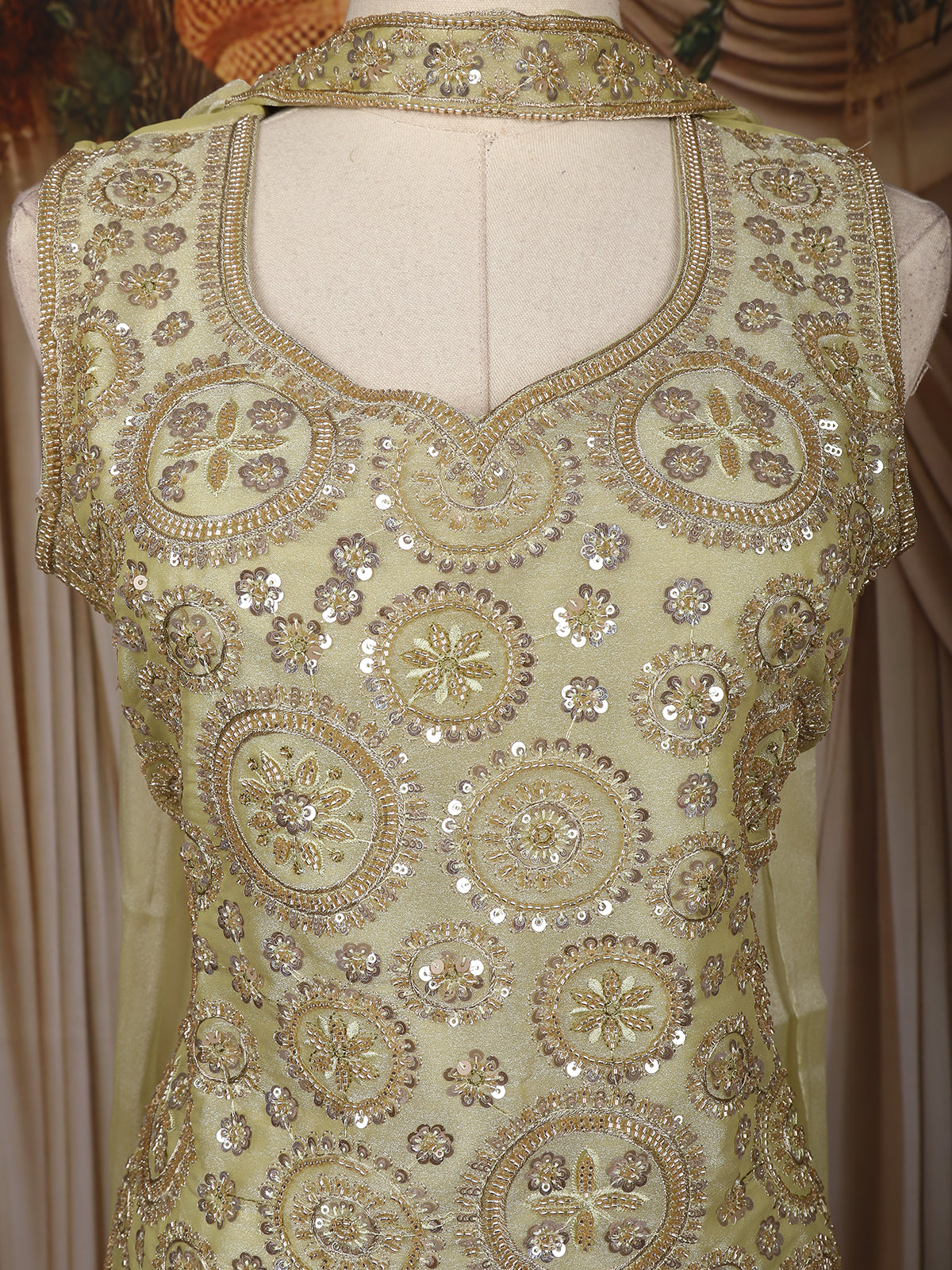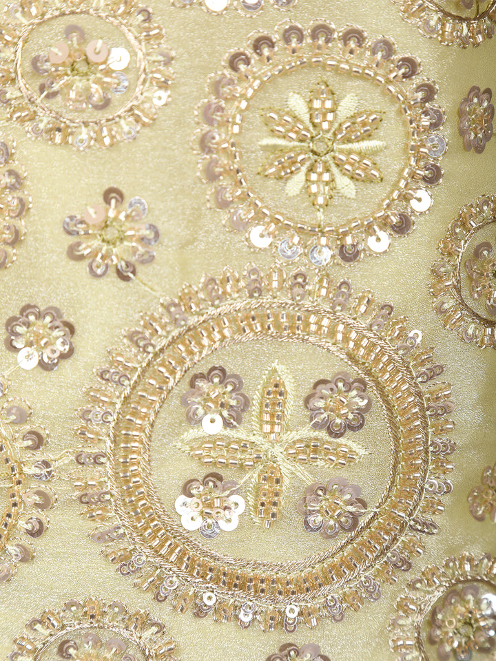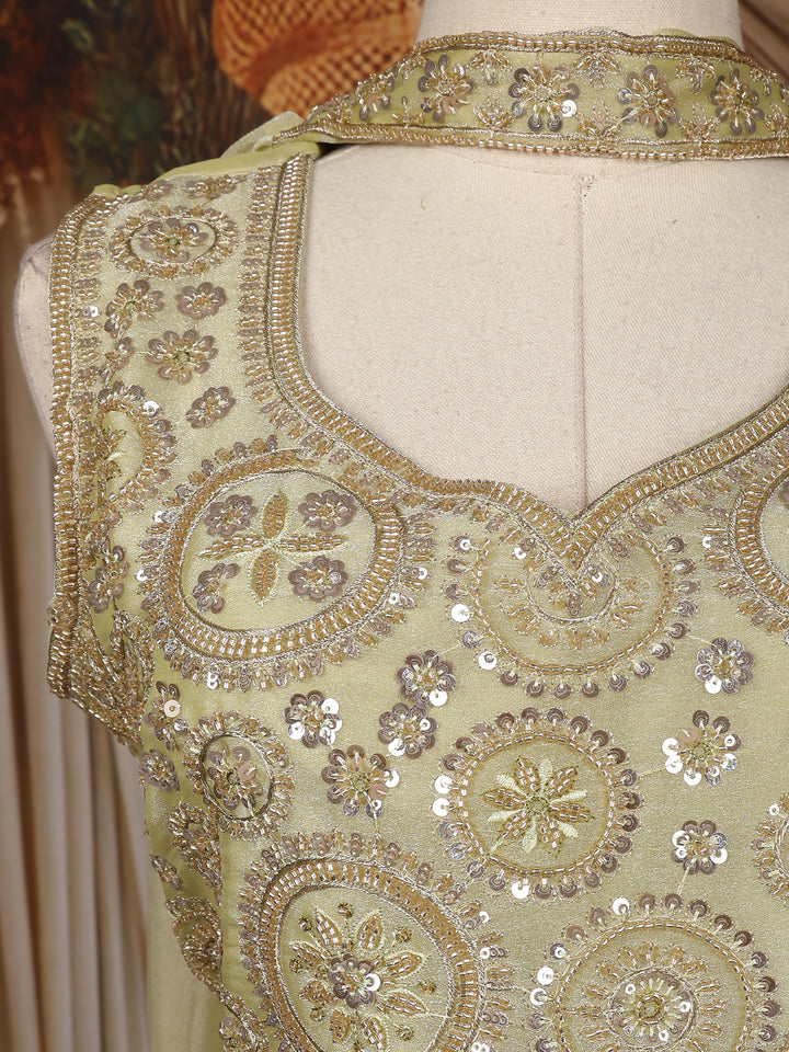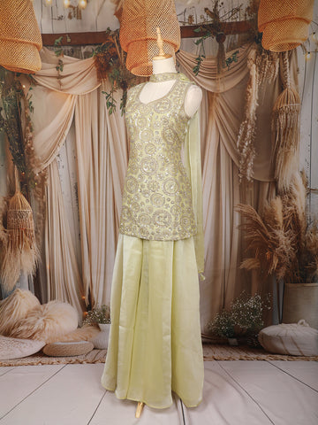 The bodice is richly adorned with floral embroidery and circular sequin motifs, adding a radiant shimmer to the pastel base. Paired with flowing organza palazzo pants, this ensemble balances comfort with festive allure. The matching sheer dupatta, delicately highlighted with light embroidery, completes the elegant look.