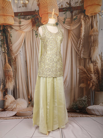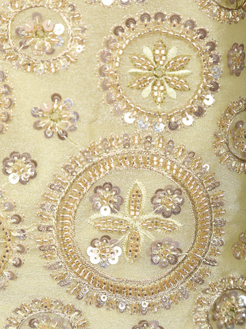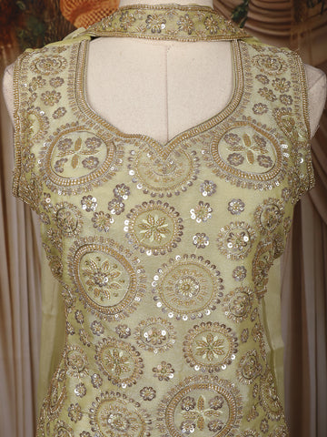 Step into sheer sophistication with this Yellow Floral Sequins Embroidered Organza Palazzo Suit, a perfect blend of subtle color and detailed craftsmanship. The sleeveless kurta features a V-notch neckline bordered with shimmering zari and sequin accents, beautifully enhancing its graceful cut.
