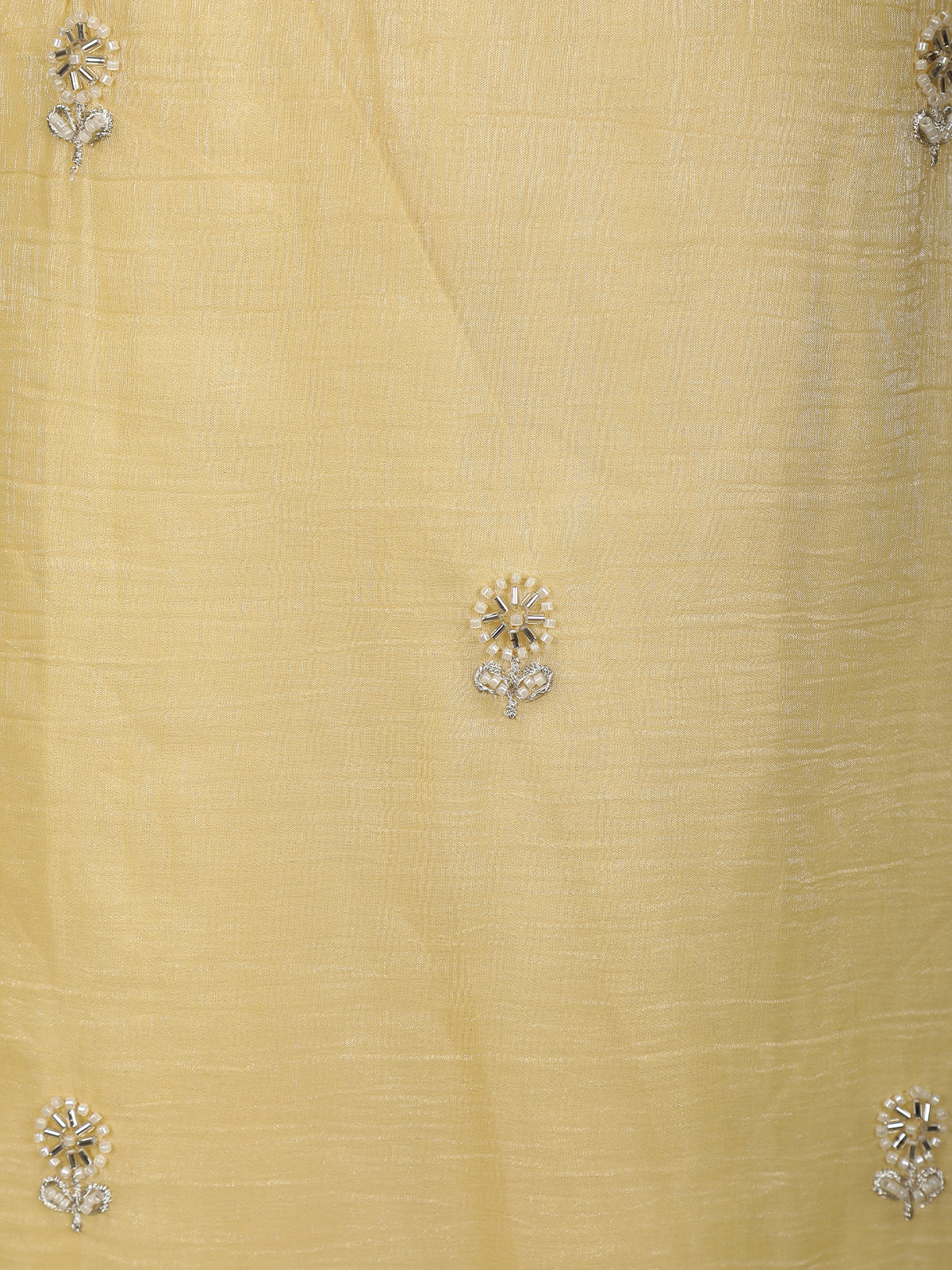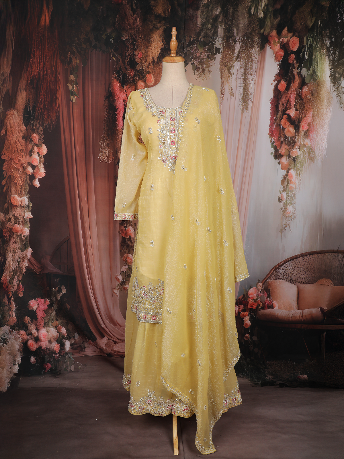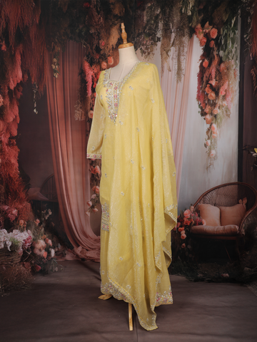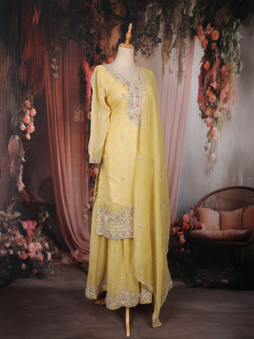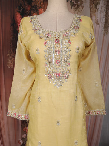 Bright and graceful, this yellow sharara suit is designed to bring effortless elegance to festive and celebratory occasions. Crafted from luxurious tissue silk, the outfit features delicate floral embroidery highlighted with shimmering sequins that add a soft glow and refined charm.