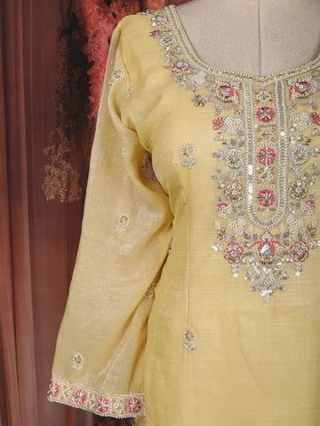 Yellow Floral Sequins Embroidered Tissue Silk Sharara Suit With Dupatta