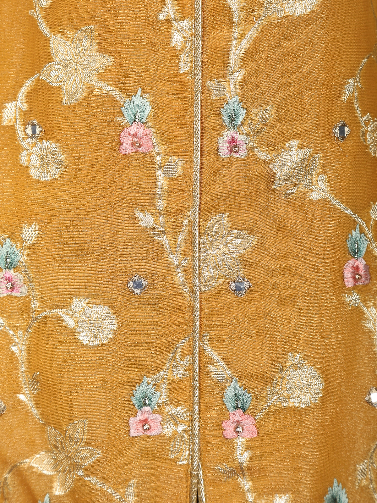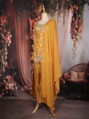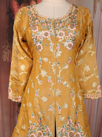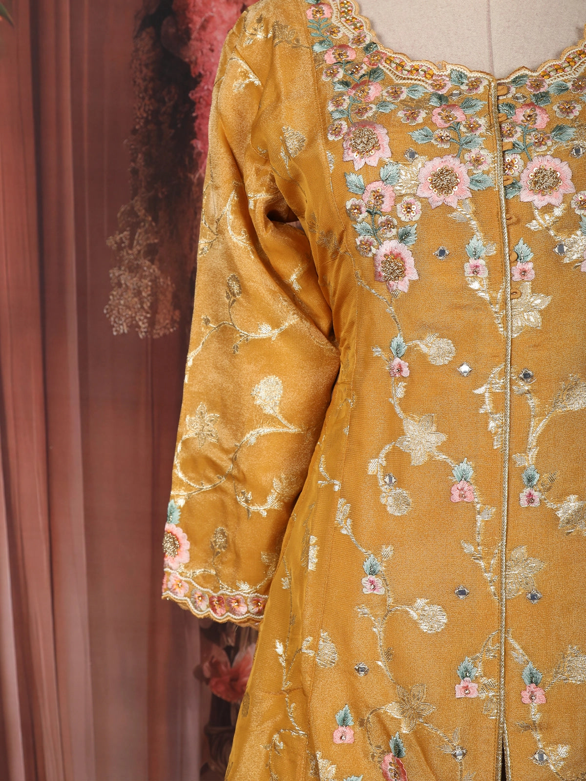 Brighten your festive wardrobe with this elegant yellow tissue silk palazzo suit, designed to blend traditional craftsmanship with refined modern style. The kurta is beautifully detailed with delicate floral thread embroidery, enhanced with subtle zari accents and fine embellishments that add a soft shimmer. Set against the warm yellow base, the intricate motifs create a graceful and uplifting appeal.