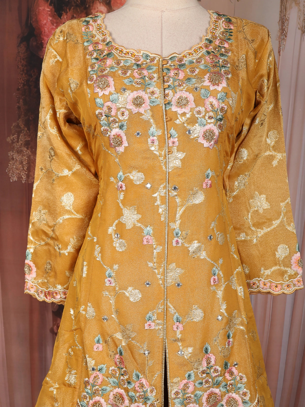 Yellow Floral Thread Embroidered Design Tissue Silk Palazzo Suit with Dupatta