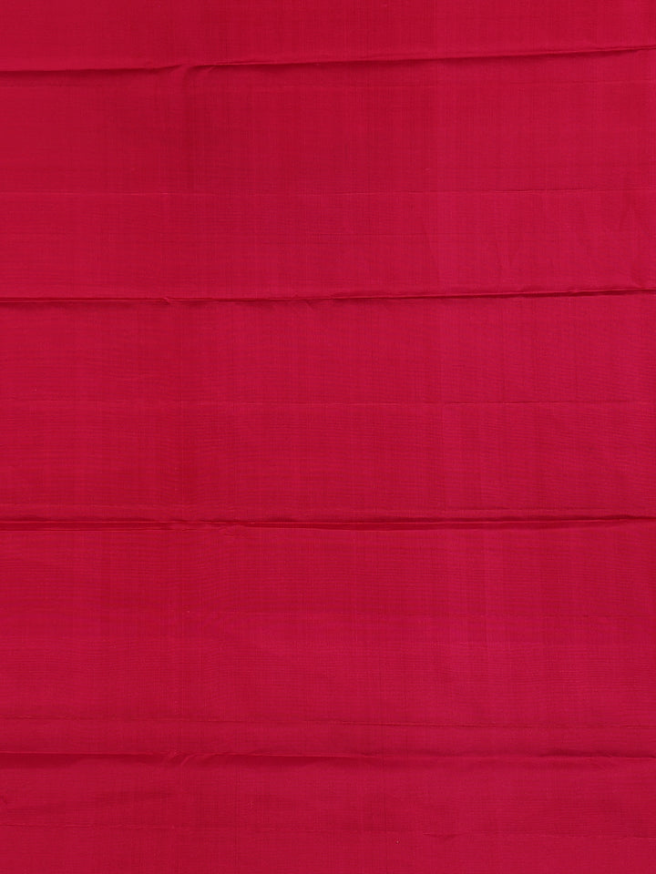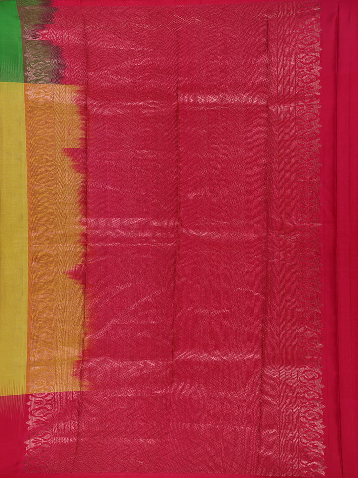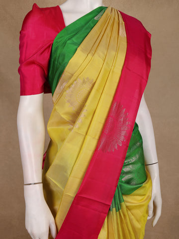 A celebration of tradition and vibrance, this Pure Kanchipuram Silk Saree is a masterpiece that brings together elegance and grandeur. The body glows in a sunlit yellow base, delicately woven with floral butta motifs in zari, adding a touch of timeless artistry. The contrasting green pleats lend a refreshing harmony, while the majestic pink pallu with intricate zari weaving exudes richness and festivity.