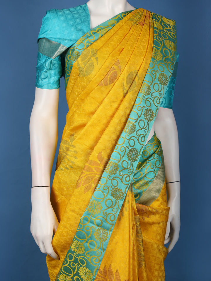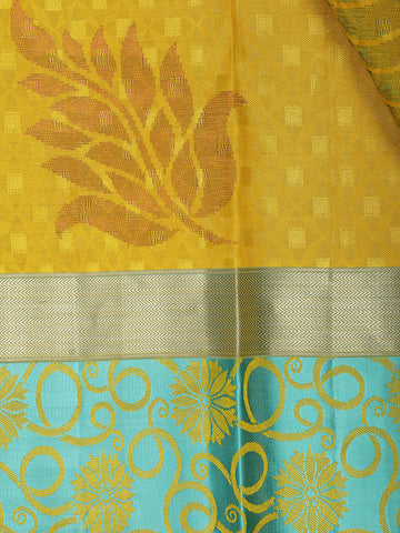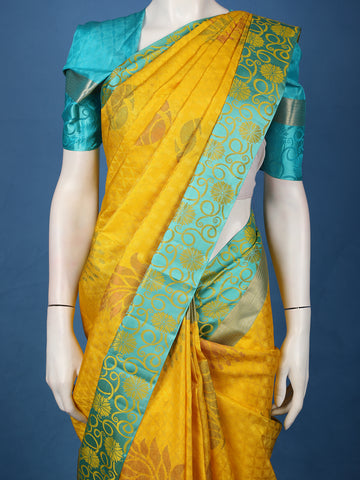 Radiate festive elegance with this Yellow Pure Kanchipuram Silk Saree, a masterpiece that embodies the grandeur of traditional weaving. The body is adorned with exquisite floral woven designs in lustrous zari, adding depth and richness to its vibrant yellow hue. The highlight lies in its striking contrast blue pallu and blouse, beautifully balancing the brightness of the saree with cool sophistication.