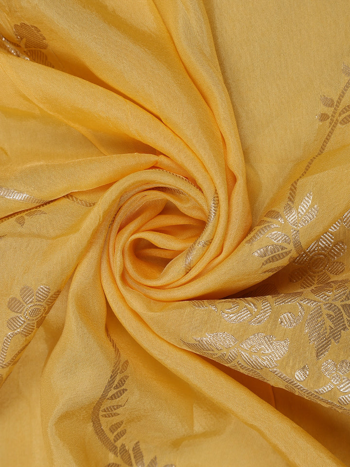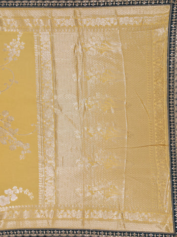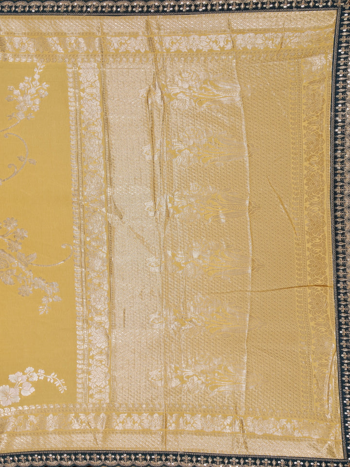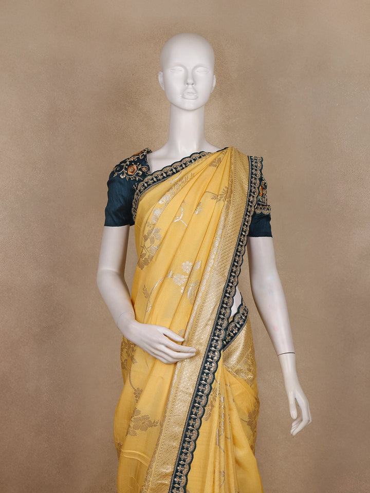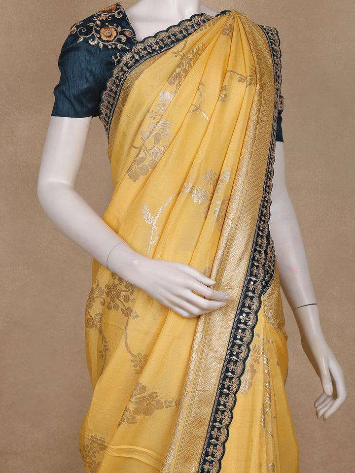 Yellow Floral Woven Semi Banarasi Saree with Scallop Border