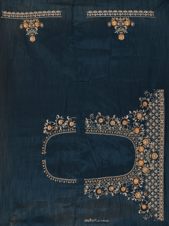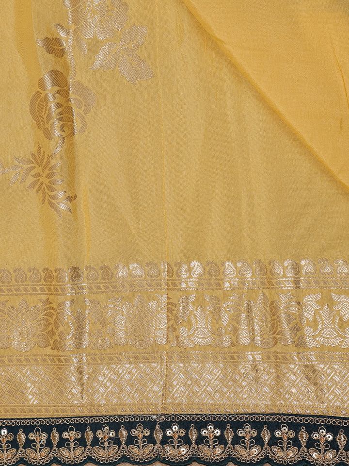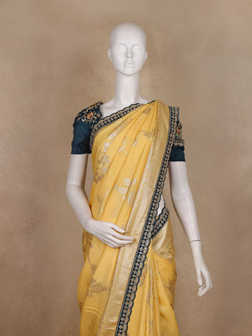 Embrace a majestic festive look with this exquisite Yellow Semi Banarasi Saree featuring charming floral zari weaving across the body. The saree is elevated with a beautifully detailed navy blue contrast border adorned with intricate zari patterns that add a royal touch to the overall ensemble. The highlight of this set is the designer navy blue blouse embellished with rich thread and zari embroidery, making it perfect for grand events. Lightweight, luxurious, and captivating — this saree is your go-to choice for weddings, festive celebrations, receptions, and traditional occasions. Style it with classic gold jewellery for a timeless heritage appeal.