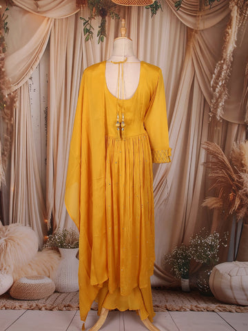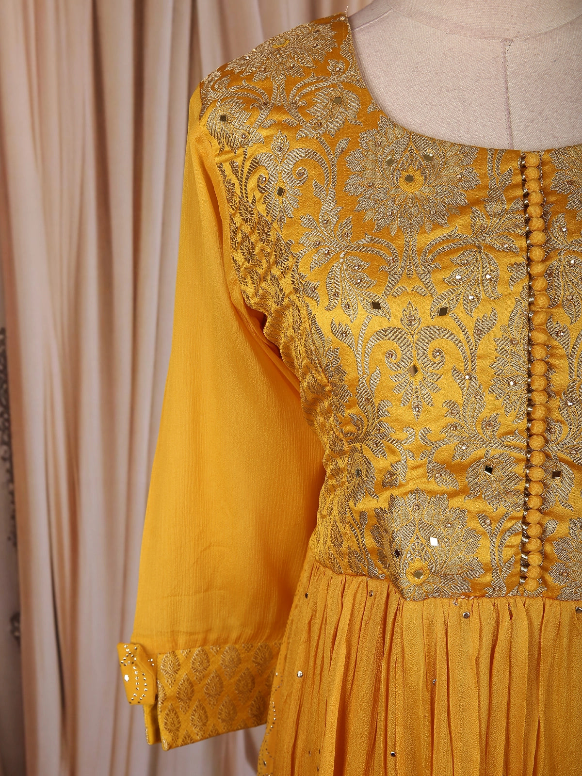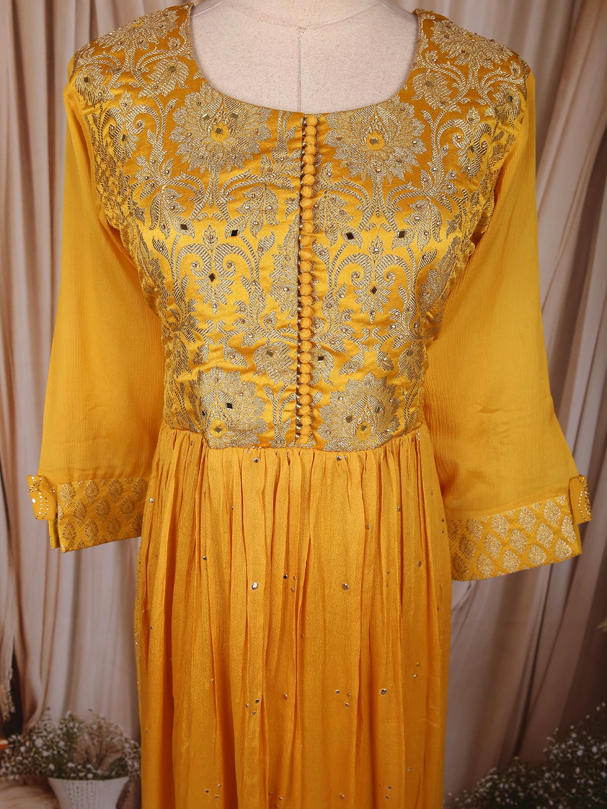 Grace your festive moments with this Yellow Floral Zari Embroidered Tissue Silk Anarkali Salwar Suit. Crafted from premium tissue silk, the ensemble showcases an intricately zari-embroidered yoke adorned with floral motifs and delicate mirror highlights that lend a subtle shimmer. The U-neckline and 3/4 sleeves with embroidered cuffs bring a refined traditional charm. The gathered flare of the Anarkali adds elegant volume, lightly scattered with sequins for a radiant finish. Paired with a matching dupatta that drapes effortlessly, this set blends royal elegance with timeless craftsmanship — perfect for festive events, wedding celebrations, and evening gatherings.