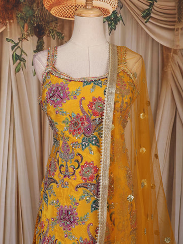 Mustard Yellow Floral Embroidered Design Georgette Palazzo Suit with Dupatta