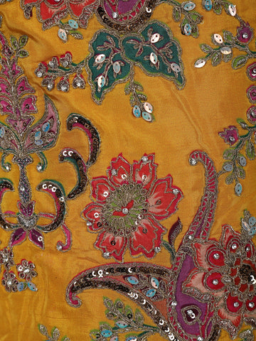 Step into sunshine elegance with this Mustard Yellow Floral Embroidered Georgette Palazzo Suit with Dupatta, a radiant ensemble designed to bring warmth and sophistication to every festive moment. Crafted in lightweight georgette, this outfit showcases vibrant floral embroidery highlighted with mirror and sequin detailing, creating a perfect balance of color and sparkle.