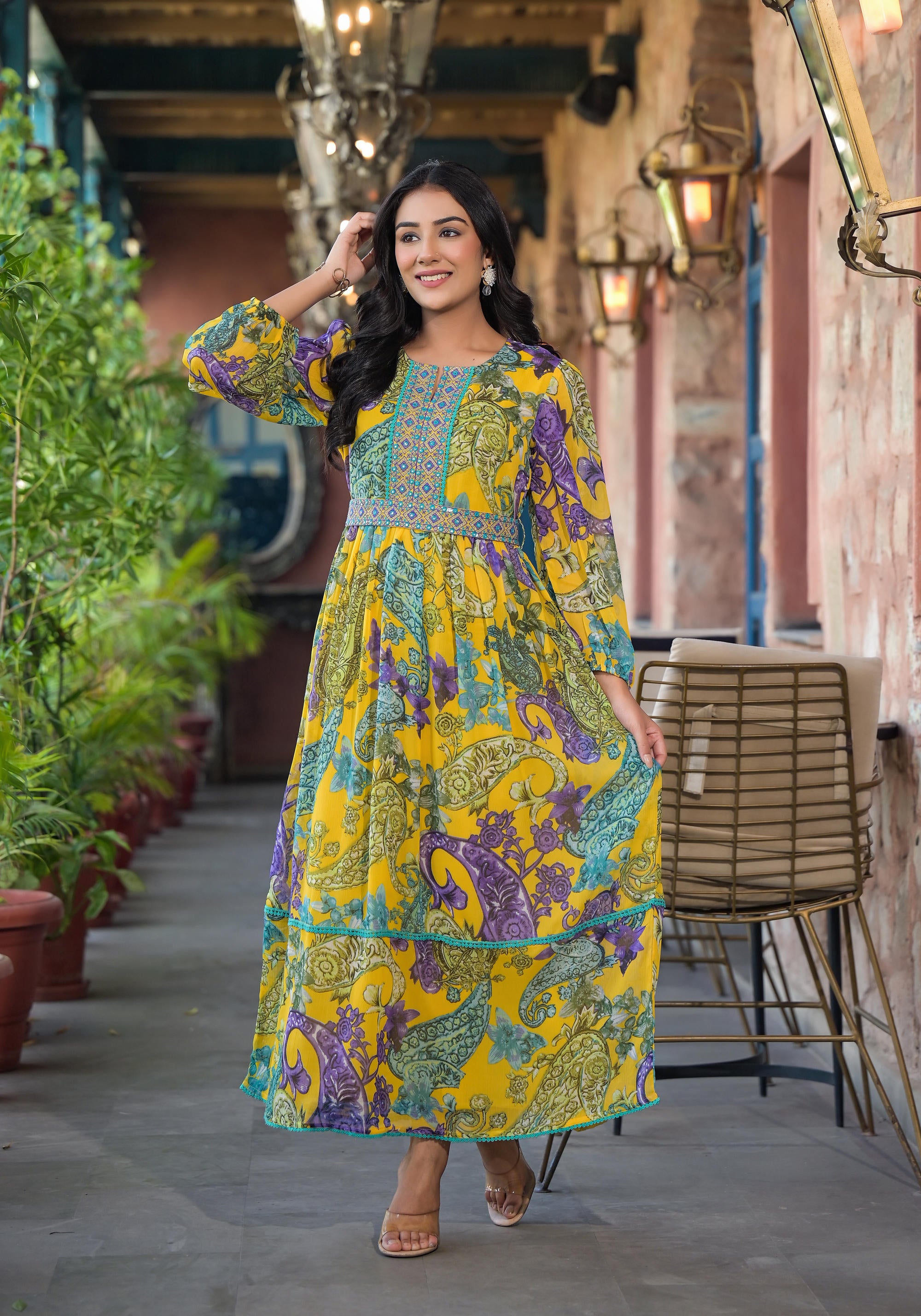Yellow Paisley and Floral Printed Georgette Maxi Dress