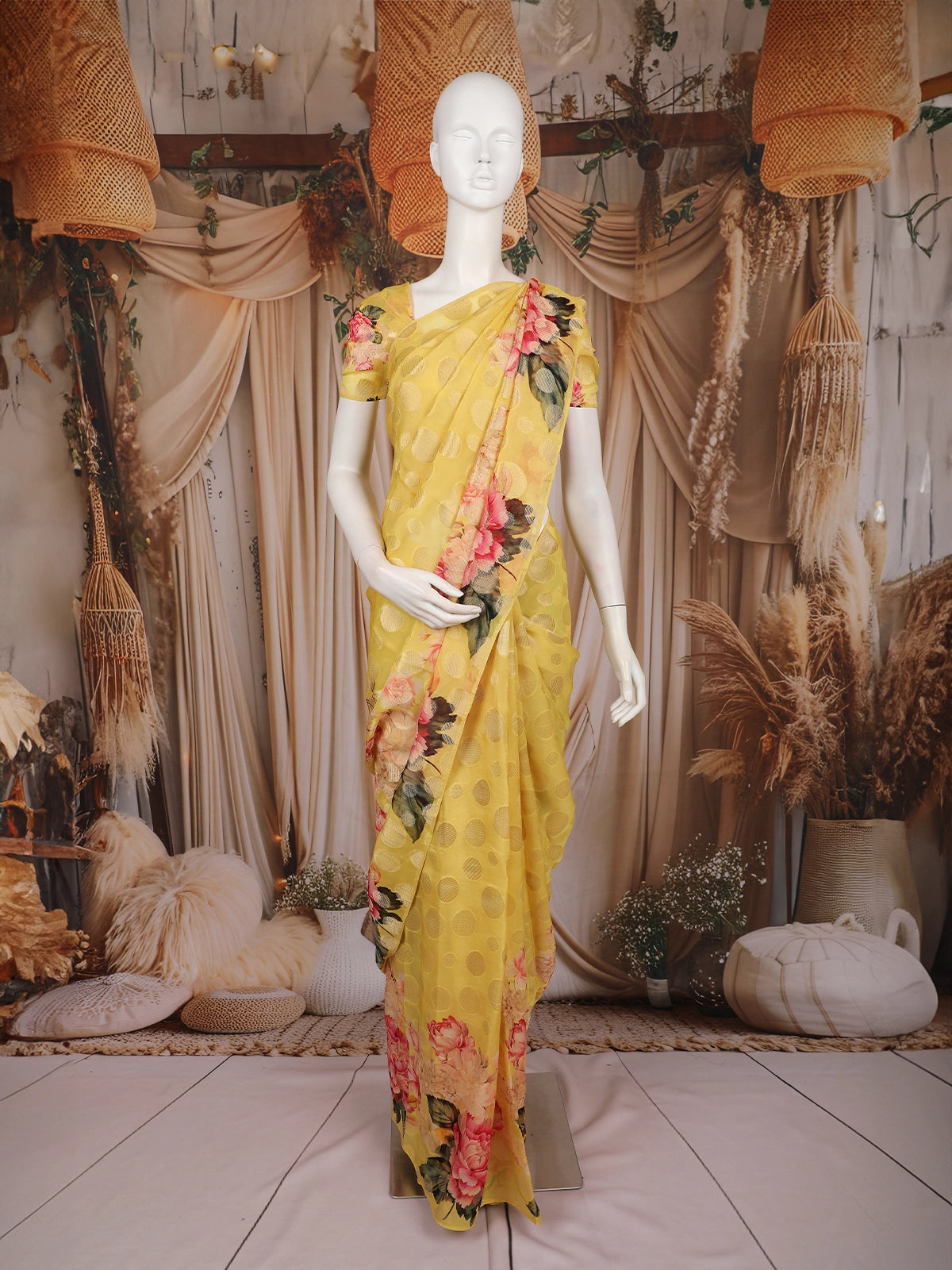 Bring sunshine to every celebration with this vibrant yellow organza saree, beautifully adorned with soft floral prints and subtle woven textured polka patterns. The lightweight organza drapes effortlessly, creating a graceful and airy silhouette that feels comfortable and elegant at the same time.