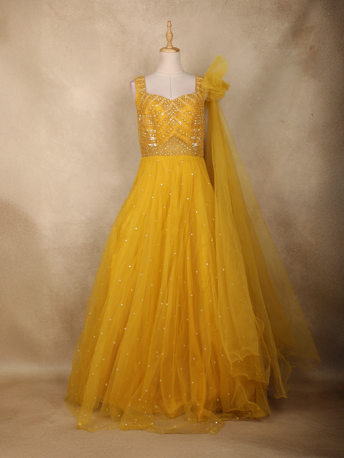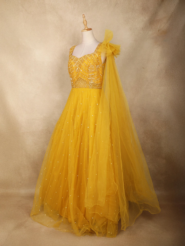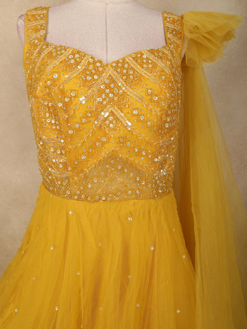 Yellow Sequins Embroidered Net Gown with One-Shoulder Dupatta