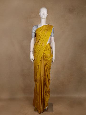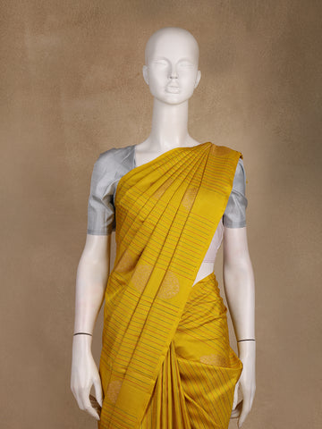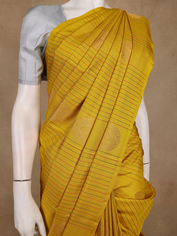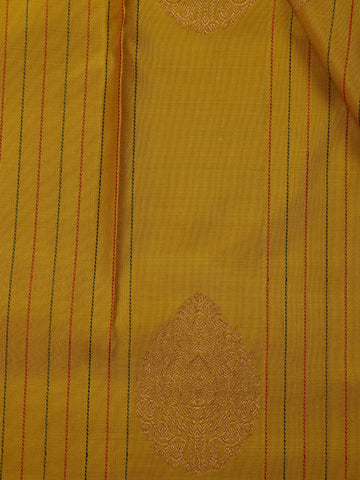 Drape yourself in the timeless grandeur of Kanchipuram artistry with this Yellow Stripes and Butta Woven Pure Silk Saree. The golden yellow body gleams with a subtle sheen, brought alive by intricately woven butta motifs and delicate linear stripe patterns that speak of meticulous craftsmanship. Each weave carries the essence of tradition while offering a contemporary appeal.