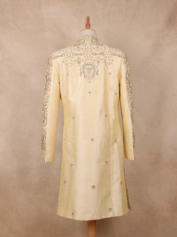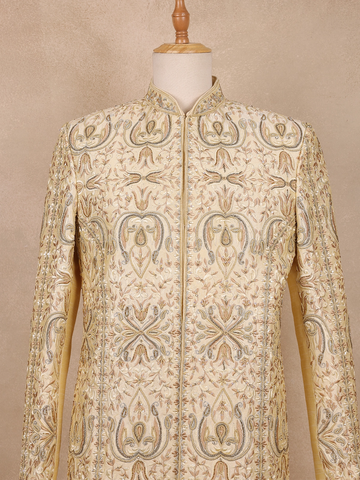 Beige Floral Embroidered Raw Silk Sherwani Suit