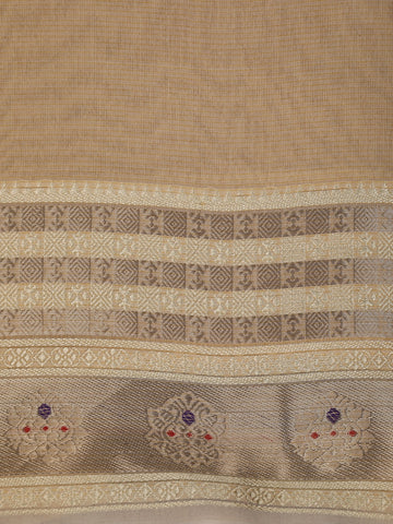The saree is accentuated by a lustrous golden zari border, adding a delicate shimmer that enhances its traditional appeal without overpowering its simplicity. The matching beige pallu flows gracefully, featuring understated zari detailing that ties the entire drape together in effortless harmony.
