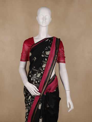 Black And Maroon Floral Printed Chandheri Cotton Saree