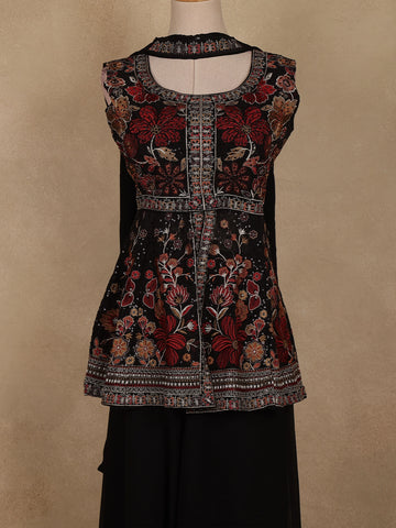 Radiate elegance with this stunning Black Floral Embroidered Georgette Palazzo Suit. The sleeveless short kurti features exquisite floral embroidery enhanced with delicate zari and sequin accents that shimmer beautifully against the dark backdrop. The U-shaped neckline adds a refined feminine touch, while the airy georgette palazzo provides both comfort and style. Completed with a flowing georgette dupatta, this ensemble is perfect for festive occasions, parties, or evening celebrations. The balance of intricate craftsmanship and graceful flow makes this outfit an effortlessly chic addition to your wardrobe.