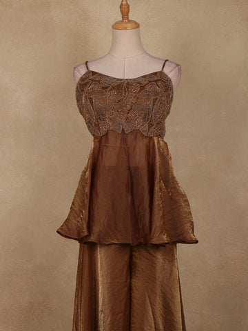 Bronze Brown Beaded Embroidered Space Silk Palazzo Suit