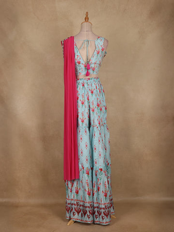 This elegant palazzo suit features a light blue floral printed crepe silk bottom paired with a vibrant fuchsia pink attached dupatta that drapes gracefully across the shoulder. The embroidered blouse is adorned with rich mirror, thread, and floral motifs in red, pink, and green tones on a pastel base, adding a touch of traditional glamour.