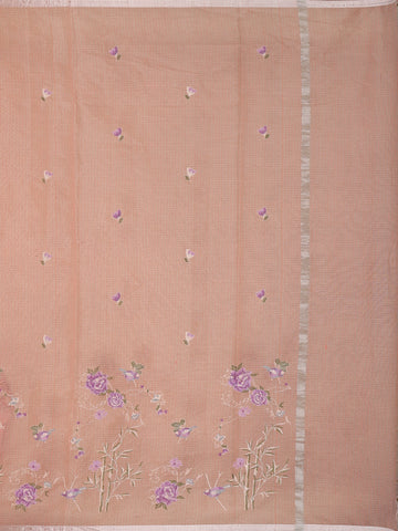 Grace your ethnic wardrobe with the soft allure of this Light Peach Floral Embroidered Kota Cotton Saree, a timeless blend of elegance and simplicity. Crafted from airy Kota cotton, this saree exudes effortless charm with delicate floral embroidery adorning its body, bringing a touch of artisanal finesse. The subtle zari border adds a gleam of tradition while maintaining understated sophistication.