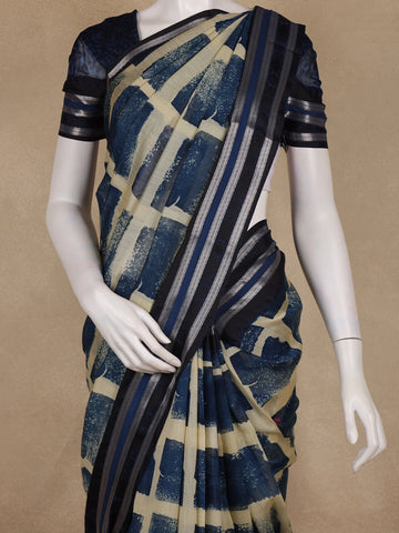 Navy Blue And Beige Abstract Brush Print Chandheri Cotton Saree