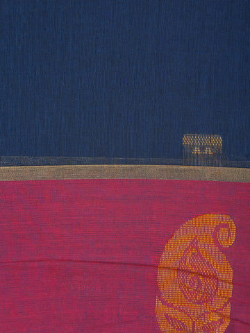 Experience understated elegance with this Navy Blue Paisley Woven Cotton Saree, crafted for women who appreciate traditional charm with everyday comfort. The saree features delicate woven paisley motifs accentuated by a vibrant magenta contrast border and pallu, detailed with golden zari highlights that add a hint of festive allure.