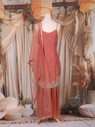 Peach Floral Embroidered Design Organza Palazzo Suit