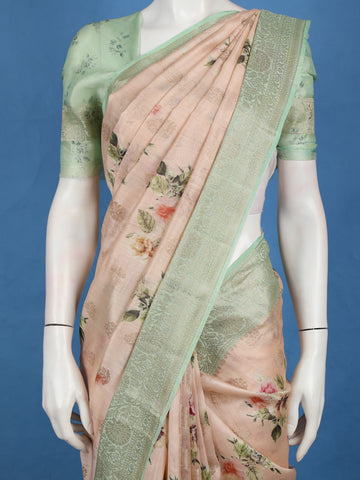 Step into understated elegance with this Peach Floral Printed Tussar Saree, a graceful blend of tradition and modern charm. Crafted from fine tussar silk, the saree showcases a soft floral digital print that blooms across the peach base, creating a soothing and refined aesthetic. The look is beautifully elevated with a contrasting green pallu and blouse, finished with a delicate woven zari border that adds a hint of festive shimmer.